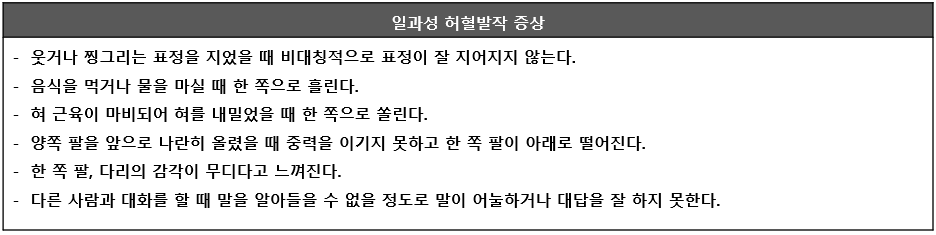 뇌경색이 발생하기 이전에 뇌경색의 위험을 강력하게 경고하는 증상이 바로 일과성 허혈발작입니다. 이는 뇌로 가는 혈액이 일시적으로 부족해져 뇌경색과 매우 흡사한 증상이 발생하지만 짧게는 몇 분이내에, 길게는 24시간 이내에 증상이 사라집니다.